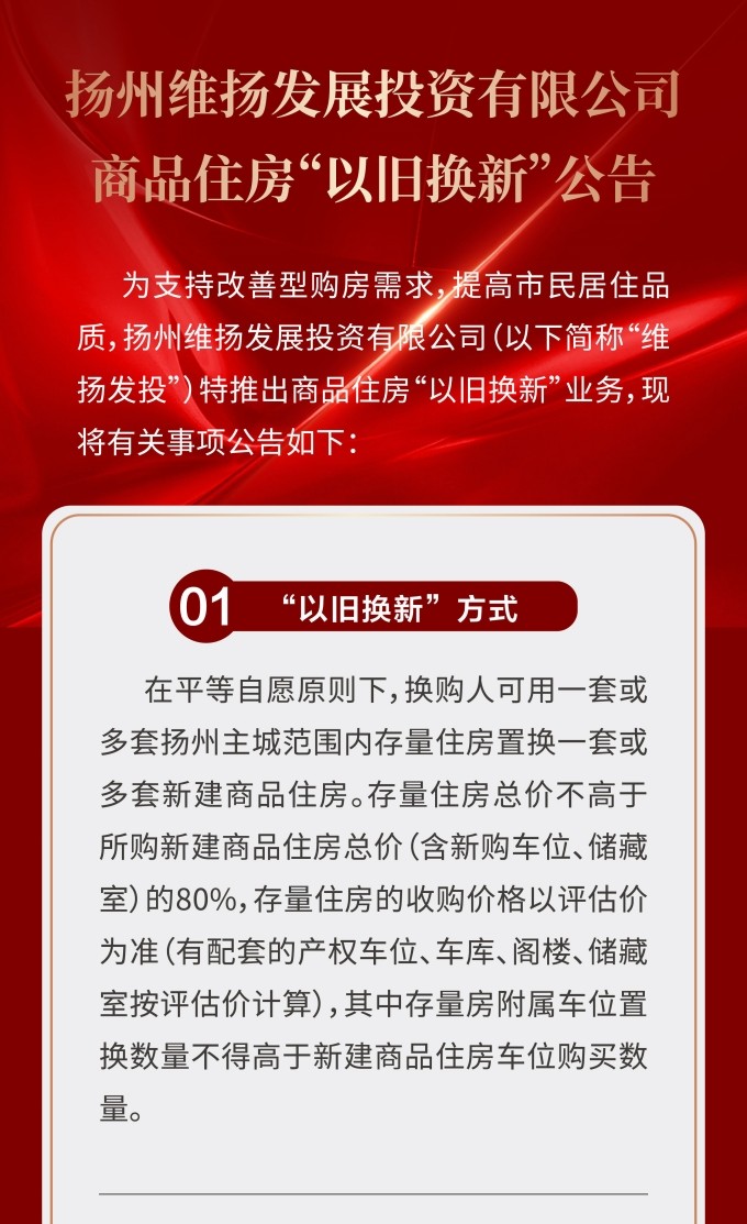 住房“以舊換新”“以房換房”是各地房地產(chǎn)新政中以“小細節”撬動(dòng)“大市場(chǎng)”的重要舉措。維揚發(fā)投積極響應政府新推行的“以舊換新”政策,踐行“惠民”理念,整合各項資源,搭建換房中心平臺,為買(mǎi)房人提供一站式以舊換新置換服務(wù),推動(dòng)激活邗江區商品房市場(chǎng)活力。 此次維揚發(fā)投“以舊換新”工作以其自主開(kāi)發(fā)的維投·山河頌項目為試點(diǎn),由國企背書(shū)、置換范圍廣、全流程專(zhuān)業(yè)服務(wù)。首批換購新建商品住房限額50套,換購人可通過(guò)登錄“維揚發(fā)投商品住房‘以舊換新’線(xiàn)上報名系統”報名,具體要求詳見(jiàn)公告。